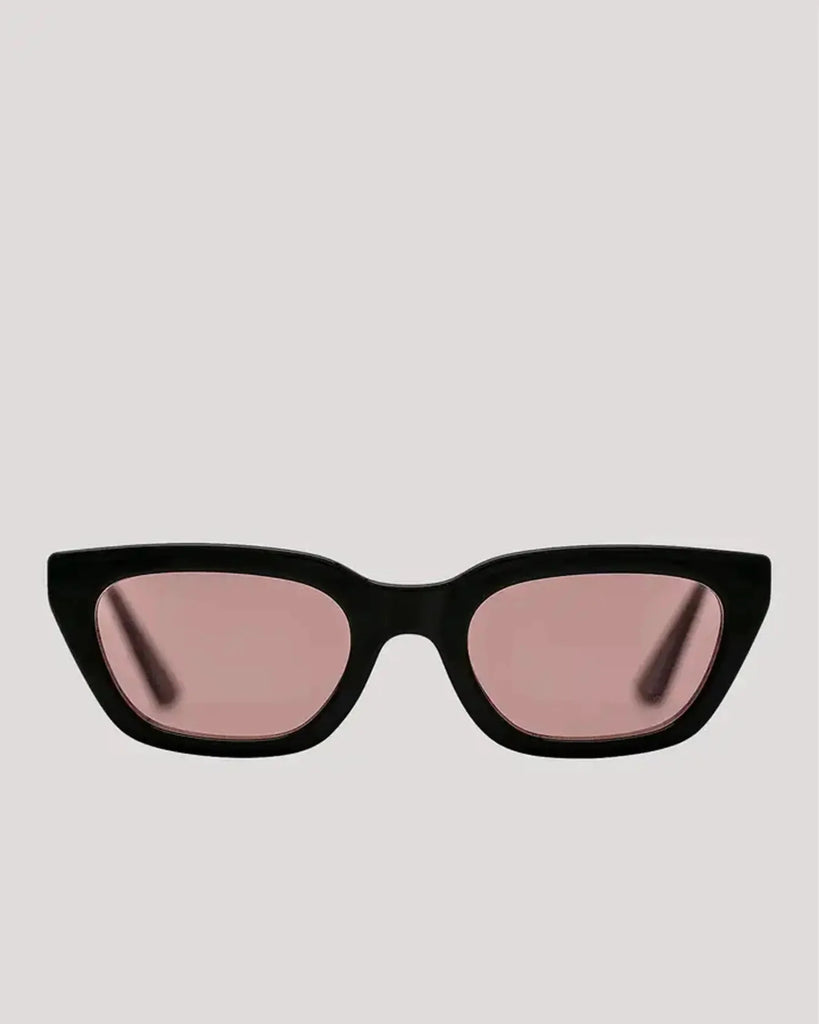 The Nove sunglasses by Otra feature a black rounded cat-eye frame with pink lenses, offering 100% UV protection and a versatile, stylish fit for everyday wear. Comes with a soft cream vegan case for safe storage.