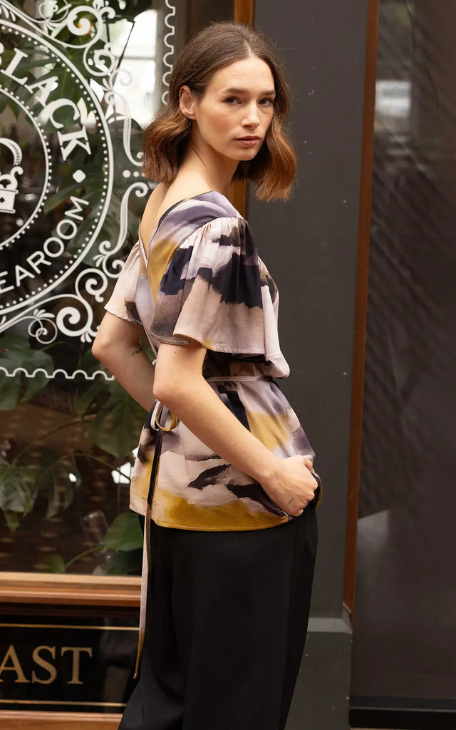The Flora Top is made from soft viscose rayon in the moody Horizon print. With short sleeves, a relaxed fit, and a reversible design offering both round and V-neck options, it’s effortless to wear. A detachable belt lets you choose between a loose, breezy silhouette or a cinched waist for versatile styling.