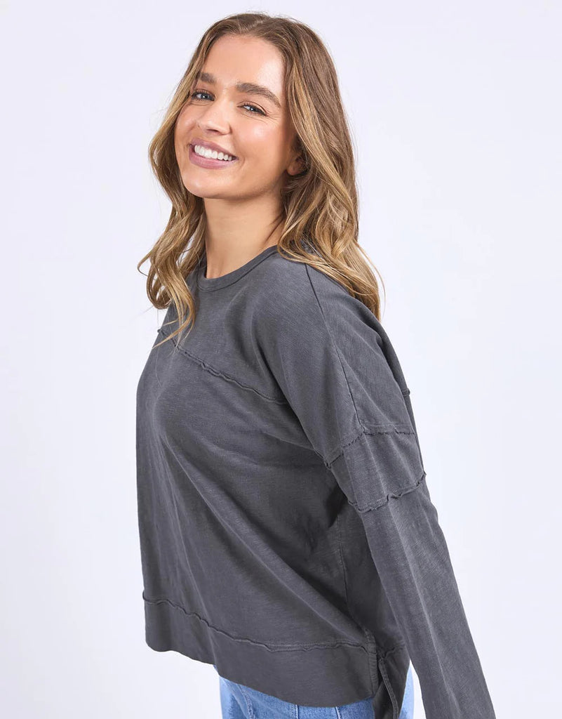 Stylish and easy to layer or wear by itself, the Throw On Long Sleeve Tee features a chest seam and raw edge details along with an exclusive front chest embroidery.