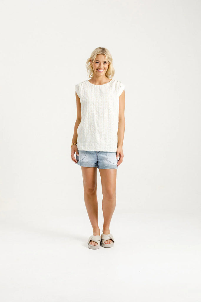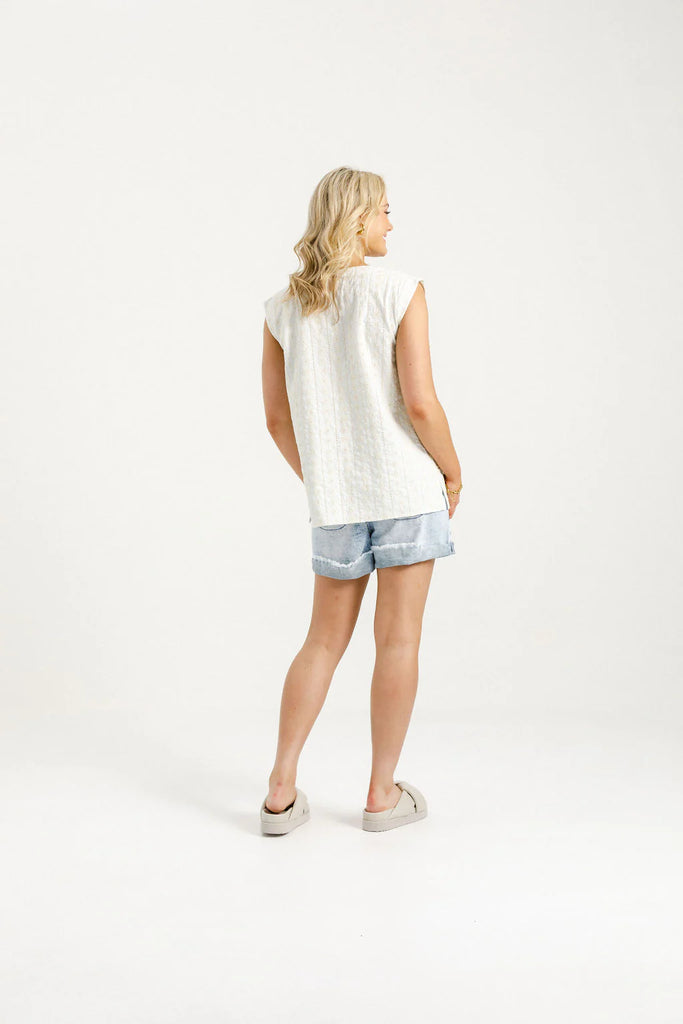 The Daisy Top is a fresh and feminine piece crafted in a fresh Meadow coloured Cotton fabric with delicate Cream embroidered Daisies.